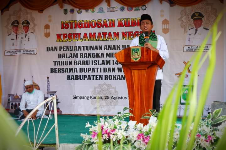 rohilpost.com, Simpan Kanan – Wakil Bupati (Wabup) Rokan Hilir (Rohil), H. Sulaiman,SS,MH menghadiri Istighosah Kubro Keselamatan Negeri dan sekaligus Santunan Anak Yatim dalam rangka memperingati Tahun Baru Islam 1443 H/2021 M, di Kecamatan Simpang Kanan, Rabu (25/8/2021).