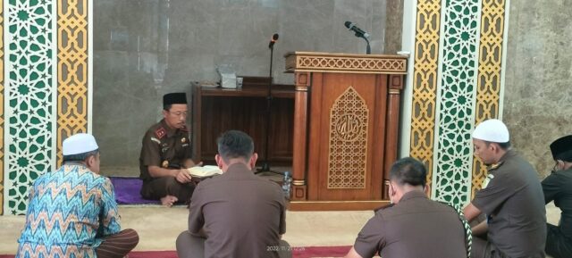 Kegiatan Tausiyah Ba’da Dzuhur di Masjid Al-Mizan Kejaksaan Tinggi Riau mengikuti secara ketat protokol kesehatan (Prokes).