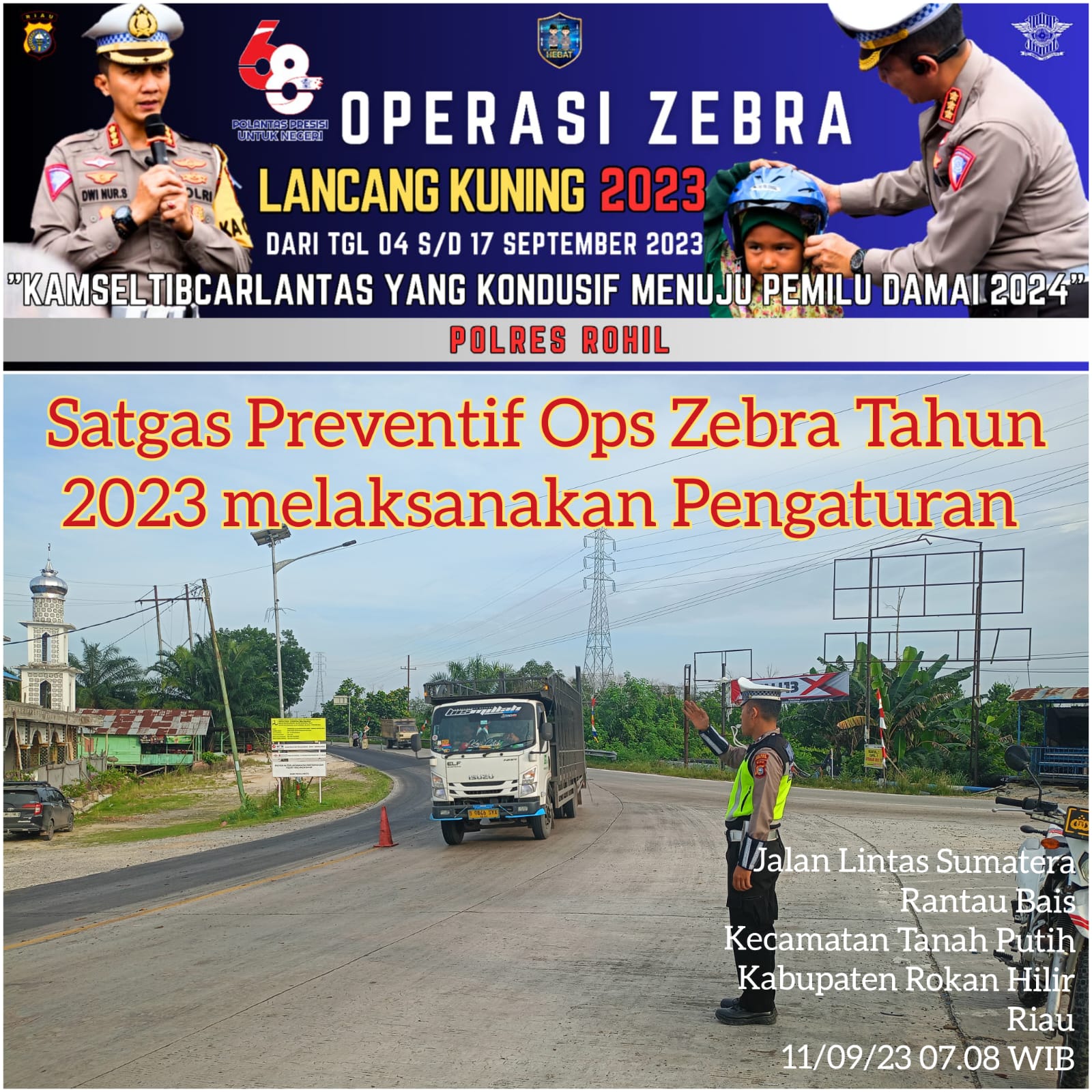 Rohilpost.COM, UJUNG TANJUNG – Dalam melaksanakan Operasi Zebra Lancang Kuning Tahun 2023 hari ke 6, Satlantas Polres Rohil melaksanakan giat Strong Point pagi dan pengaturan lalin.