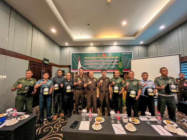 rohilpost.com, Ambon – Jaksa Agung Muda Pidana Militer (Jam-Pidmil) Kejaksaan Agung (Kejagung) Republik Indonesia, Mayor Jenderal TNI DR. Wahyoedho Indrajit, S.H.,M.H melaksanakan kegiatan Sosialisasi Nota Kesepahaman antara Kejaksaan Republik Indonesia dengan Tentara Nasional Indonesia Nomor 4 Tahun 2023 dan Nomor : NK/6/IV/2023/TNI tertanda Jaksa Agung Republik Indonesia ST. Burhanudin dan Panglima TNI Laksamana Yudo Margono, S.E.,M.M tentang Kerjasama Dalam Pemanfaatan Sumber Daya dan Peningkatan Profesionalisme di Bidang Penegakan Hukum, Selasa (07 Mei 2024) jam 10.00 WIT, bertempat di Ballroom Hotel Swiss-Bell Ambon.